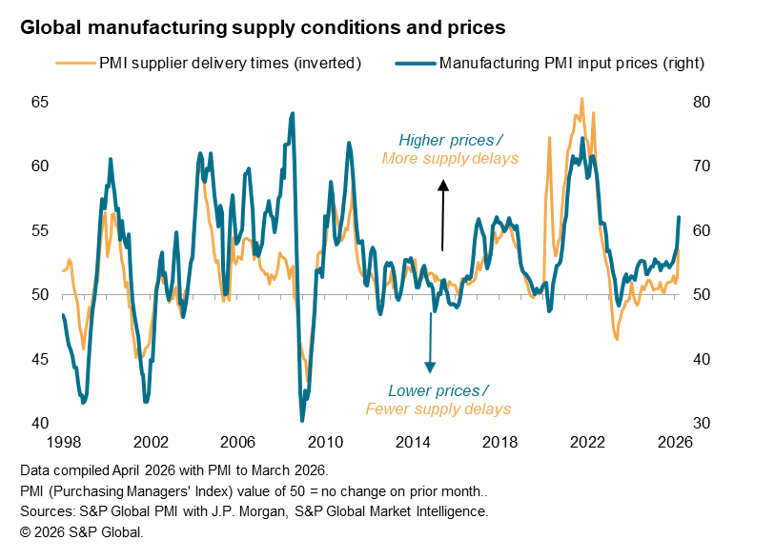 However, the biggest change in the five variables which comprise the PMI was seen in the suppliers’ delivery times index, which signalled the greatest degree of global supply chain delays since October 2022. Worsening delivery delays were generally associated with the impact of the war in the Middle East, and notably the knock-on effects of the halting of shipping through the Strait of Hormuz.