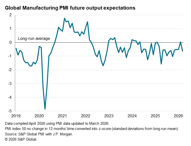 First, business expectations fell globally among the PMI survey panels to the lowest since last October. This deterioration is a disappointment after business confidence had shown promising signs of recovering in the opening months of 2026. Optimism had climbed to a 21-month high in February amid moderating concerns over US tariff policy. Not surprisingly, the outbreak of war at the end of February has been the principal factor behind this relapse, taking the forward-looking indicator of the survey to a level back below the long-run average.