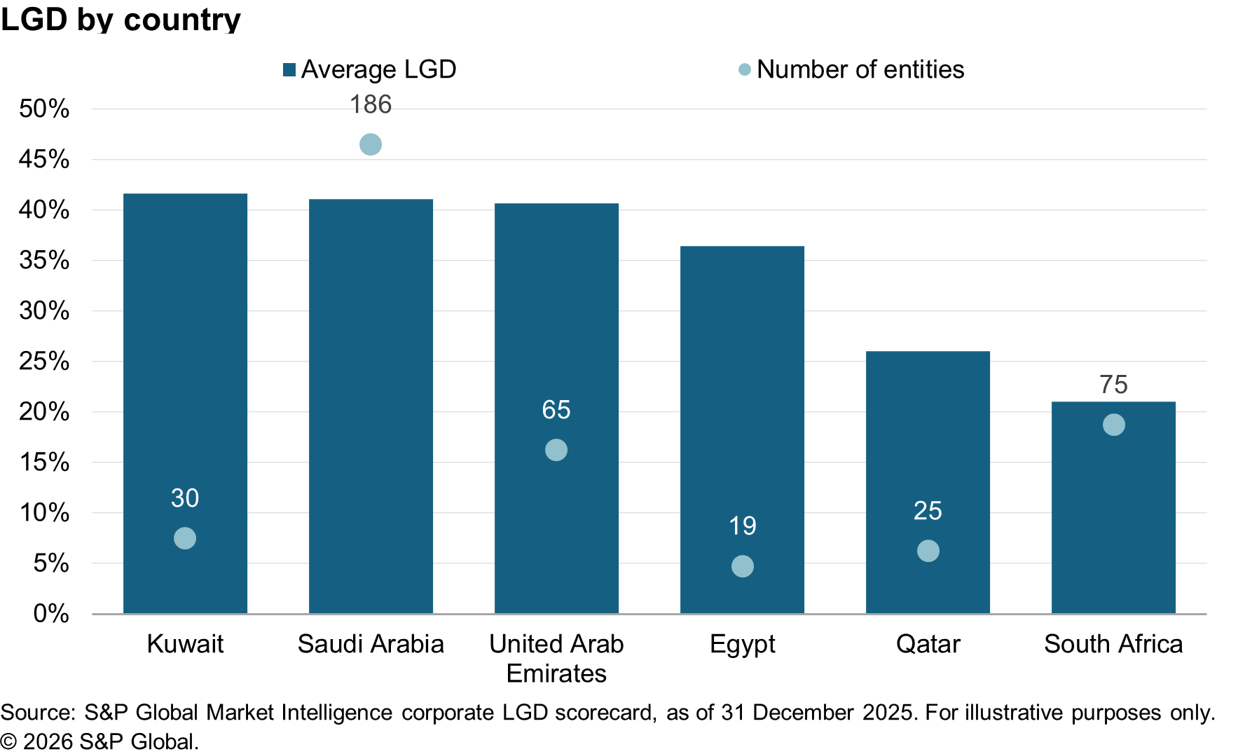 Loss Given Default (LGD) is one of the most intuitive ways to think about downside in credit: if a company defaults, how much of the exposure might not be recovered? In this first post of our quarterly series, we summarize LGD estimates as of Q4 2025 for corporate constituents of the S&P Dow Jones Middle-East and Africa BMI Index, using the S&P Global Market Intelligence LGD scorecards.