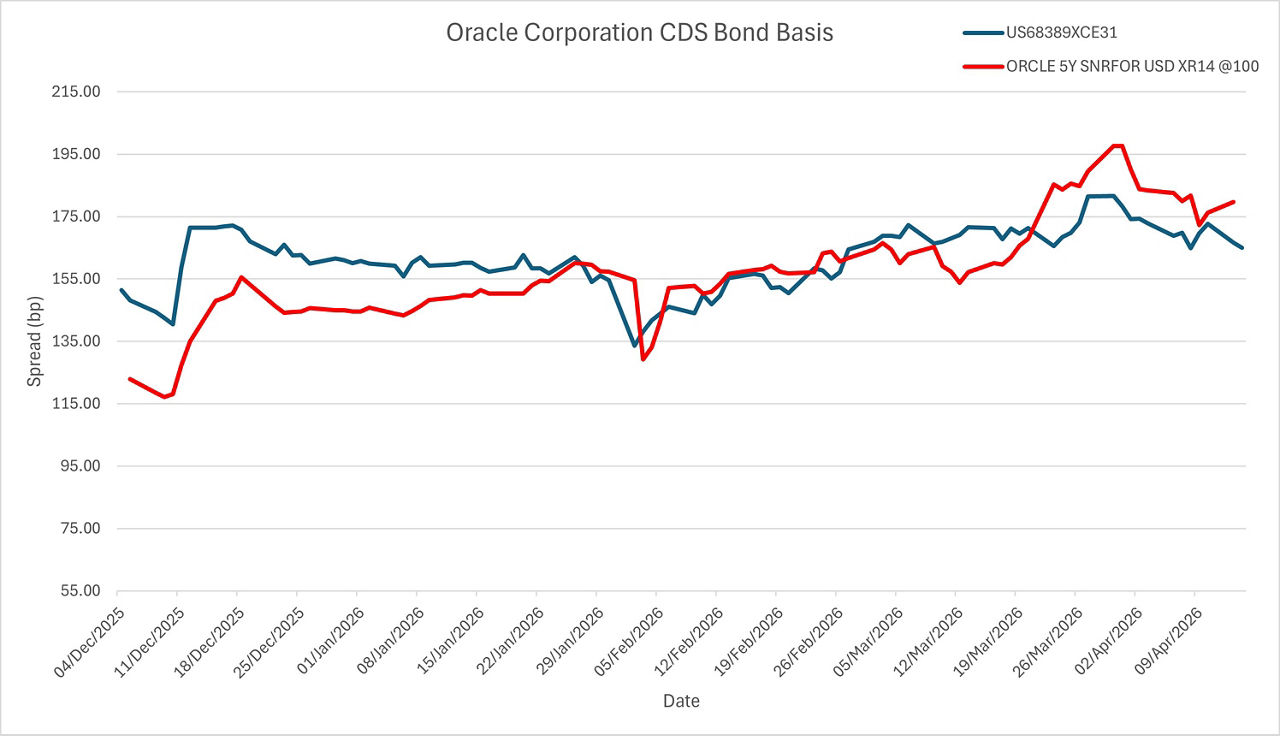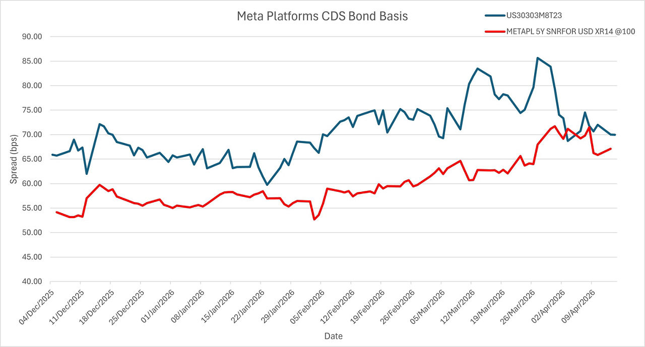 CDS–bond basis behavior highlights clear issuer‑level differences, even among large‑cap hyperscalers. In the data shown, Meta’s 5‑year bonds trade persistently wide to CDS, with a negative basis of roughly 0 to −37 bps that remains stable as bond and CDS spreads move directionally together. Oracle, by contrast, exhibits materially higher volatility, with basis gaps ranging from −50 bps to +18 bps and nearly double the variability of Meta (standard deviation of 17.9 bps vs. 8.5 bps). Unlike Meta, Oracle has experienced repeated periods of bond and CDS realignment, indicating a more dynamic basis relationship.