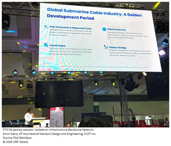 The foundation of the Philippines' digital ambitions rests on international and domestic infrastructure. Arvin Siena, vice president and head of network design and engineering at PLDT Inc., shared infrastructure backbone network updates, with an overview of how the industry is experiencing accelerating demand driven by the expansion of the digital economy, rapid growth of cloud computing, the rollout of 5G networks, and the rise of AI. Siena noted that submarine cables typically have an economic lifespan of 15 to 20 years before newer systems with significantly higher capacity make them less competitive. At present, 12 international submarine cables and nine stations connect the Philippines to the rest of the world. According to Siena, seven more cables and six new stations are underway for the future. In addition, he presented on seven upcoming key submarine cable projects scheduled between 2026 and 2029, with investments from international and regional telecom consortia. These projects would install about 68,000 additional kilometers of submarine cable, positioning the Philippines as a global connectivity hub.