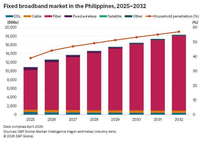 These comprehensive insights from telco industry leaders align with the current state of Philippine fixed broadband as reflected in recent S&P Global Market Intelligence Kagan data. Fixed-broadband subscribers are projected to grow strongly from 2025 to 2032, with total broadband households expected to increase from 10.9 million to 18.4 million, representing a 6.4% compound annual growth rate over seven years. This expansion is driven by fiber households growing from 9.1 million in 2025 to 17.1 million in 2032, while the technology's market share is projected to rise from 83.3% to 93.1%.