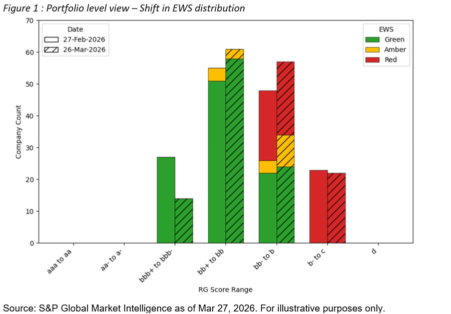Figure 1 illustrates the impact of the ongoing conflict in the Middle East on publicly listed companies in South Africa. It compares the distribution of companies across RG score buckets and corresponding EWS signals at two points in time, prior to the conflict and at the end of the fourth week. A clear shift is observed, with a significant drop in the count of companies with a credit score better than bbb- and a migration into higher risk categories, particularly within the “bb- to b” bucket.