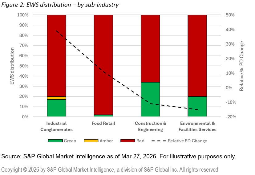 Among the most impacted sub-industries, Industrial Conglomerates have experienced the highest deterioration, with the average RG PD increasing by approximately 39% (from 0.92% to 1.28%). This rise is likely driven by their sensitivity to macro uncertainty, demand slowdowns, and supply chain disruptions, given their diversified and globally exposed operations. This is followed by Food retail, which saw an 11% increase in average PD (from 0.68% to 0.75%).