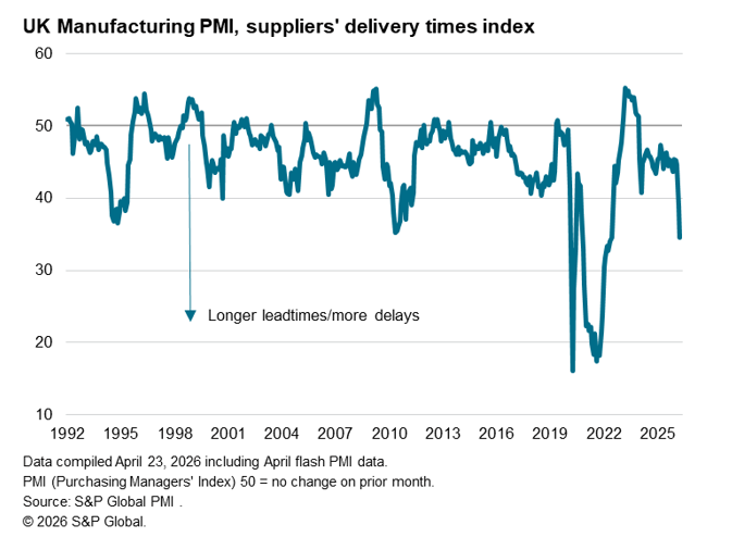 A further major impact on the economy from the war is evident through a spike in the number of supply chain delays. Manufacturers reported the greatest lengthening of supplier delivery times since June 2022. Barring the pandemic, the lengthening of lead times seen in April was the highest since data were first available in 1992, and was overwhelmingly blamed by survey participants on disruptions caused by the conflict in the Middle East.