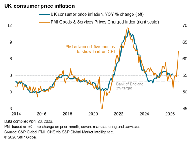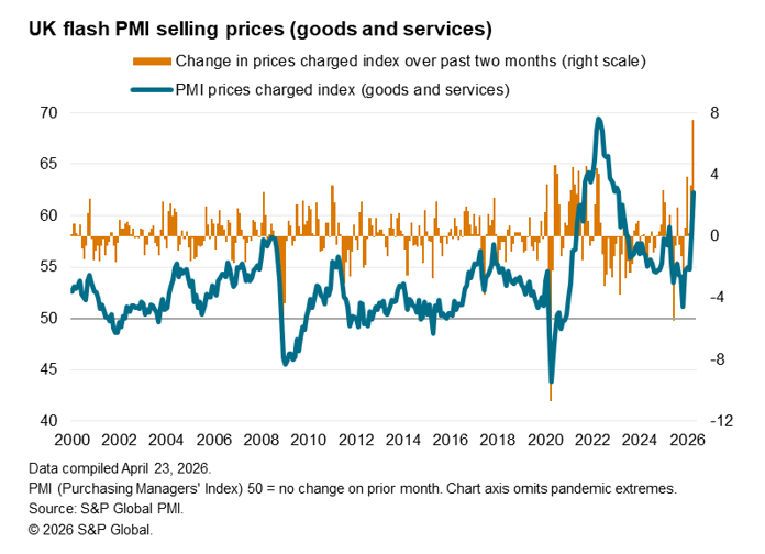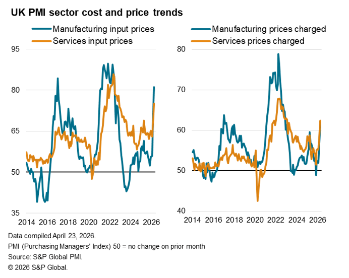 Higher selling prices reflected higher costs. Service sector input cost inflation jumped to the greatest extent on record for the survey, reaching its highest since November 2022, while factory input cost inflation also accelerated sharply, building further on the spike seen in March (which marked the sharpest rise in the index since 1992). That took manufacturing input cost inflation to its highest since June 2022.