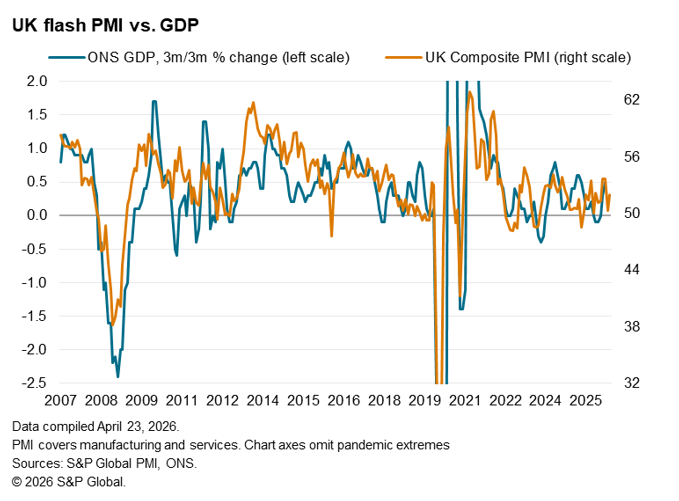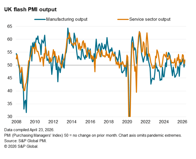 A promising start to the year faded in March as some businesses reported a drop in activity linked to the outbreak of war in the Middle East, but economic growth has rebounded in April. Having slumped from 53.7 in February to just 50.3 in March, the headline Composite PMI Output Index has risen to 52.0 in April, according to the preliminary ‘flash’ reading.