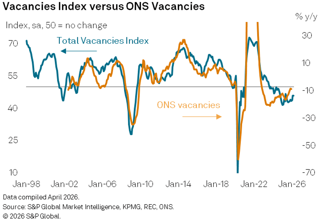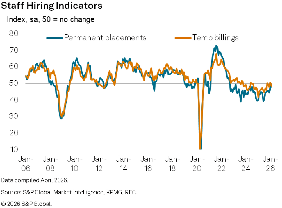 Although hiring trends became more stable, overall demand for workers continued to fall solidly at the end of the first quarter. That said, the latest reductio in vacancies was the softest recorded since last May and weaker than the trend seen over 2025. Demand for both permanent and temporary staff fell at fractionally slower, but still marked, rates in March.