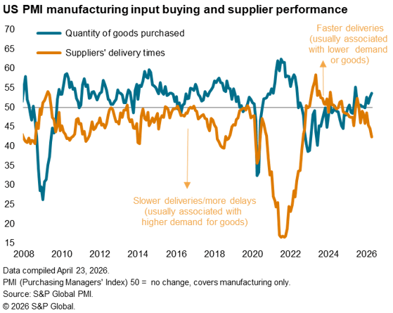 War-related issues led to increasingly widespread supply problems, adding to existing supply delays which have been largely blamed on tariffs. Factories reported the greatest lengthening of supplier delivery times since August 2022, with lead times having now lengthened continually over the past eight months. In addition to shipping-related disruptions due to the war, shortages were also linked to the additional purchasing of safety stocks. Purchasing activity rose at the second-fastest rate seen for nearly four years, beaten only by the jump in buying activity seen shortly after last spring’s tariff announcements.