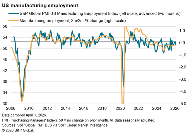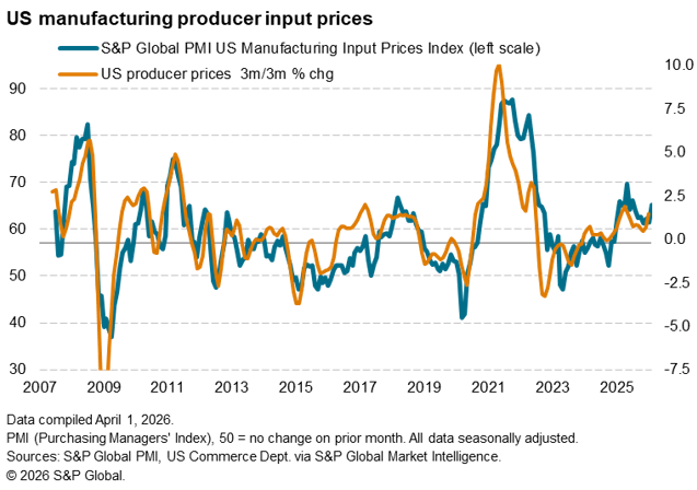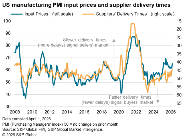US manufacturers reported faster growth of output and order books in March, pointing to encouraging resilience in the face of the outbreak of war in the Middle East. However, key areas of concern at the moment are prices and supply chains. A sharp rise in prices and delivery delays has cast a cloud over the outlook, threatening to drive inflation higher, dampen demand and throttle supply chains.