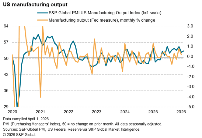 S&P Global’s manufacturing PMI surveys indicated rising output among manufacturers in March, the rate of growth ticking higher to round off a solid first quarter. Production has now risen for eight straight months, with the March PMI reading consistent with a monthly rise in industrial production of approximately 0.5%.