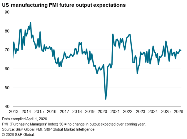 Sustained optimism in part reflecting reduced concerns over government policies such as tariffs, but also indicated that producers anticipate only a short-term and modest impact from the war. Much therefore hinges on the duration of the war and its related energy market disruption.