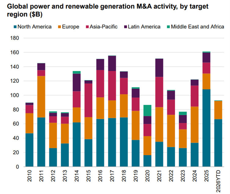 M&A activity across the global power and renewables sector reached its highest level since 2007 in 2025 and has remained elevated into 2026, with dealmaking heavily concentrated in the United States. According to the S&P Global Energy’s Global Power and Renewables M&A Review, North America has accounted for nearly 70% of transaction value since the start of 2025, driven primarily by acquisitions of US gas generation and large-scale renewable platforms.