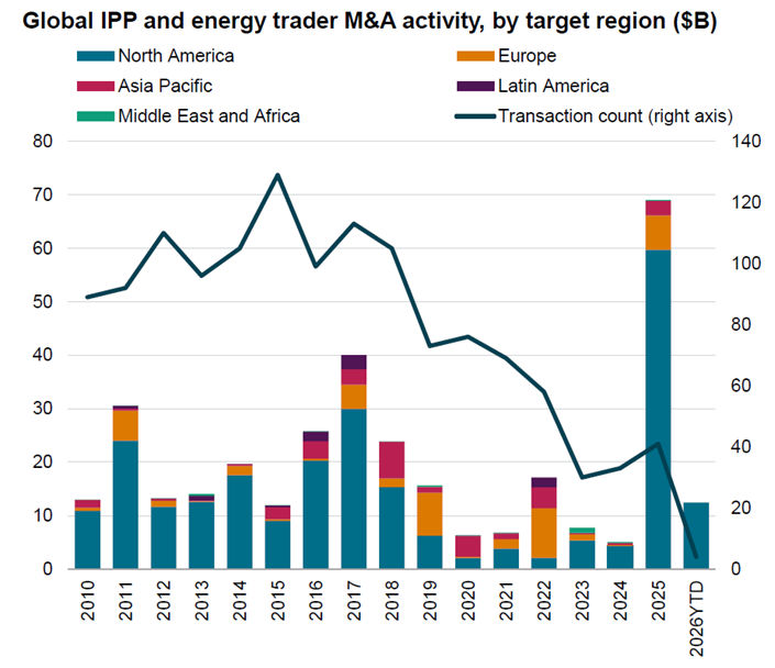 IPP deal values surged to $69 billion in 2025—the highest level since 2007—with 87% of that value concentrated in North America. The report attributes this to a wave of large-scale US gas transactions aimed at expanding baseload and flexible capacity.