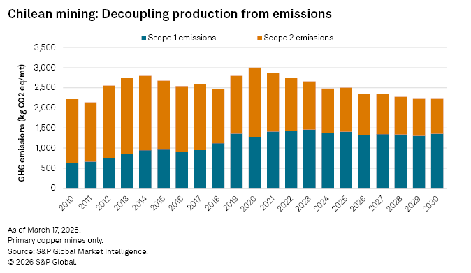 Energy is the second major pressure point. Modern Chilean copper mines face declining ore grades, increasing operational depths and high energy requirements simultaneously — a triple burden that compounds costs at every stage of extraction and processing. The sector's reliance on diesel exposes it to volatile global energy markets, with recent tensions around the Strait of Hormuz driving higher global fuel prices and highlighting the vulnerability of fuel‑intensive operations, particularly those in remote locations with limited grid access. Between 1990 and 2020, emissions from copper and other mining activities in Chile tripled, driven in part by greater diesel consumption as operations scaled up to compensate for falling ore quality. However, since 2020, the sector has begun abating emissions as major mines transition to renewable electricity and implement decarbonization commitments.