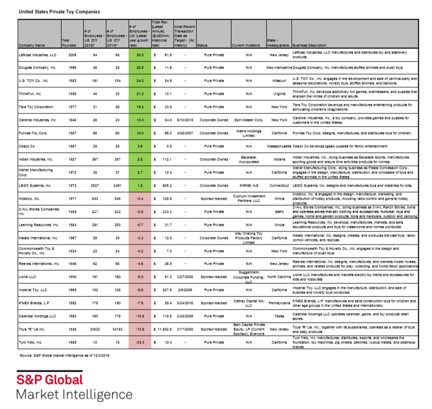 In Q4 2016, S&P Global Market Intelligence released the United States private company headcount data to the S&P Capital IQ platform, sourced from the U.S. Department of Labor 5500 forms. This stocking stuffer is something our clients are excited to use year-round. This data is the source for consistent employee metrics for companies that typically have limited disclosures in the U.S. market. In this analysis, we have outlined 23 toy companies with employee count, revenue, and latest transaction data available on the S&P Capital IQ platform. We have layered in some basic context so you can quickly see when these companies were founded, where they are located, and what type of toys they produce or manufacture.