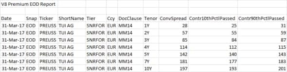 So, if a bank wanted to calculate Market Price Uncertainty for a CDS position, they would need dispersion data on the Markit CDS mid-level (the composite spread). Markit now provides this in the new CDS premium end-of-day report. As well as standard deviations on spreads, upfronts and bid-ask spreads, the report also includes 10th and 90th percentiles.