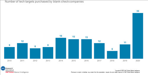 Special purpose acquisition companies (SPACs) came from nowhere to take up a significant slice of the tech M&A market last year. The survey suggests that they're here to stay. SPAC acquisitions of tech targets surged to 35 in 2020, more than double the activity of any other year. In our survey, respondents – at a rate of three to one – expect to see more of them in the next three years. A full 66% said tech purchases by blank-check companies would rise, with just 22% anticipating a decline.