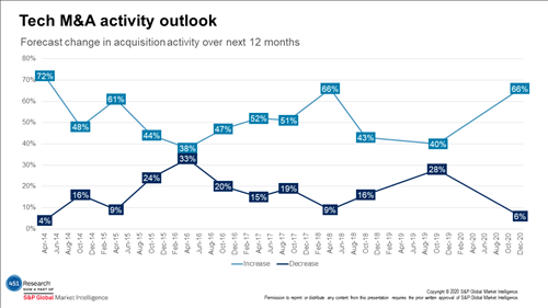 Dealmakers overwhelmingly expect the tech M&A market to build off its record run in 2020. Respondents to the Tech M&A Leaders' Survey delivered their most optimistic forecast in almost seven years, with two-thirds of them anticipating an increase in acquisitions. And there was hardly a naysayer to be found – only 6% said activity would decrease.