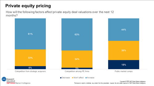 There was notable consensus that competition for deals would push up pricing on PE acquisitions – a consensus that was absent from previous surveys. Nearly two in three (63%) forecast contested transactions among PE firms to increase M&A prices. A nearly identical 61% said the need to beat out strategic buyers would also propel multiples in 2021. In our year-ago survey, the majority didn't expect either form of competition for deals to impact pricing. Still, that will be weighed against the prospect of a recession, which, in the current survey, 61% said could be a drag on PE multiples.