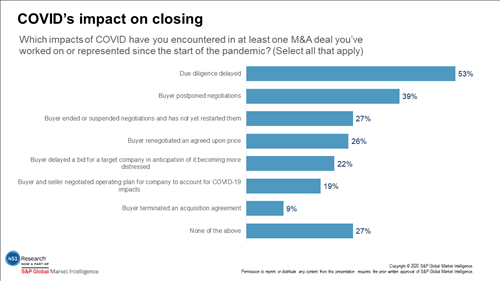 The pandemic's impact has, of course, done more than change buyers' tech priorities: It has altered how deals come together. A delay in due diligence was the most common COVID-induced obstacle our respondents experienced, with 53% saying it occurred in a transaction they worked on as a result of the outbreak. That was followed by a buyer postponing negotiation (39%). And a notable, although smaller, number of respondents related more severe challenges to closing deals, including acquirers renegotiating an agreed-upon price (26%), buyers delaying a bid in anticipation of a target becoming distressed (22%), and the termination of a purchase agreement (9%).