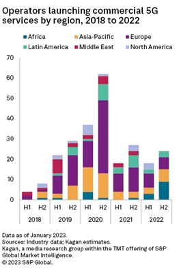 Twenty-four new operators were added to this list in the second half of 2022. Africa had nine new launches in this period, the most since we began tracking 5G launches in 2018. These included Orange SA in Botswana, Safaricom PLC in Kenya, Société Française de Radiotéléphone (SFR) SA in Réunion, MTN Group Ltd. in Nigeria and Zambia, Telkom SA SOC Ltd. in South Africa, Vodacom Group Ltd. in Tanzania and Unitel SA in Angola.