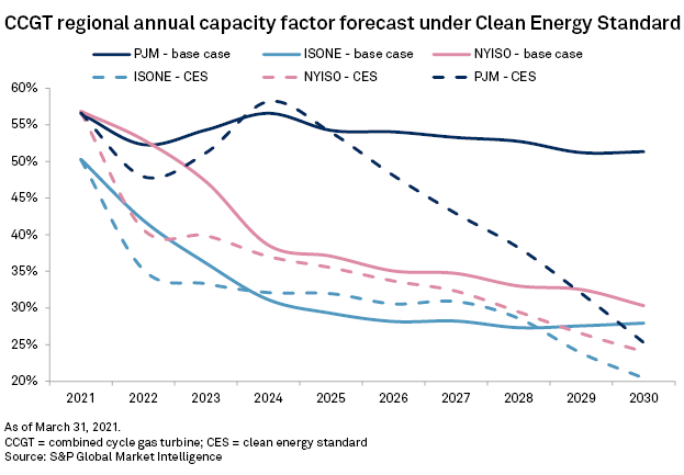 A more rapid push to decarbonize would create bigger risks. Market Intelligence estimated the impact on fleet capacity factors of targeting 80% green generation by 2030 across all three ISOs. This target is consistent with interim targets of the federal Clean Energy Standard, or CES, currently under consideration. Forecast reductions in fleet utilization in NYISO and ISO-NE show only modest reductions because current targets are relatively aligned with the CES. On the other hand, PJM would see much larger impacts, as RPS targets for New Jersey, Maryland and Virginia were applied across all PJM states.