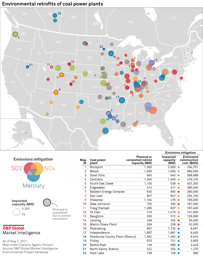 According to the S&P Global Environmental Project Database, over 100 coal power plants totaling 130 GW – more than half the existing U.S. coal-fired fleet – have undergone or are planning to undergo environmental retrofits in some form. Market Intelligence estimates the total capital cost of these projects to be nearly $34 billion. The financial hit of different types of retrofits can vary substantially but retrofits on larger plants to address multiple types of emissions can cost well over $1 billion.
