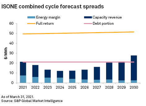 Market Intelligence estimates that in ISONE a new CCGT needs to earn a minimum spread of $21/MWh from its energy production and capacity revenues. Under the current Market Intelligence forecast for wholesale electricity and capacity prices, this spread is realized only three years out of the next 10, with an average revenue contribution closer to $18/MWh during that time, potentially inadequate to service debt.