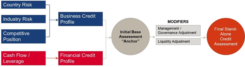 As shown In Figure 1 below, the SME Scorecard uses the proven most current S&P Global Ratings' criteria-driven risk dimensions, including: country/industry risk, competitiveness and profitability, cash flow/leverage, management/governance and liquidity. It enables users to analyze a company's business and financial risk profiles using a combination of quantitative and qualitative inputs to determine a base credit assessment (i.e., an anchor). It then facilities a modification of the base assessment with additional management and liquidity-related risk factor adjustments to arrive at a final stand-alone credit assessment profile. Performance testing shows that 75% of the Scorecard outputs, on average, are an exact match or within one notch of the S&P Global Ratings’ credit rating.