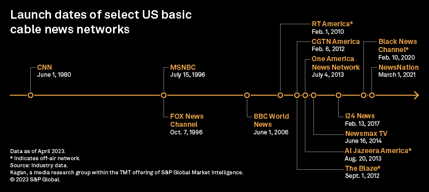 As more general entertainment viewing migrates to streaming and on-demand platforms, live news has emerged as a dominant genre on linear cable networks. While there are now a dozen 24/7 cable news networks in operation in the U.S., Warner Bros. Discovery Inc.'s CNN (U.S.), Comcast Corp.'s MSNBC (U.S.) and Fox Corp.'s FOX News Channel (U.S.) stand out as the major players in the space.
