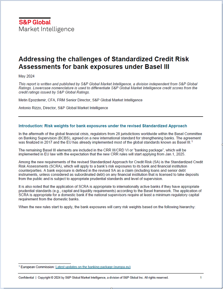 In this whitepaper, S&P Global Market Intelligence addresses the challenges of Standardized Credit Risk Assessments for bank exposures under Basel III, including changes to risk-weighted assets and SCRA implementation.
