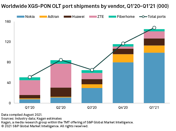 As of first quarter 2021, Nokia became the first (and only) vendor to report shipments of 25G PON-ready ports (including those delivered in 2020). This data reflects the fact that half of Nokia's multi-PON line cards are shipped with the vendor's multi-PON optics, which enable operators to upgrade to 25G PON via software upgrade.