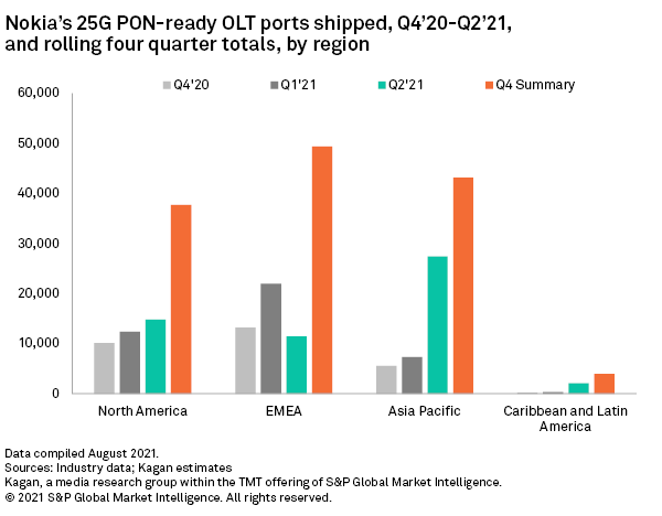 Nokia's leadership of the emerging XGS-PON market is evidenced by the more than 300,000 XGS-PON optical line terminal, or OLT, ports it has shipped, and more than 1 million optical network terminal, or ONT, units shipped through second quarter 2021. With more than half of its OLT ports supporting multi-PON — i.e., line cards capable of supporting GPON, XGS-PON and 25G PON — the stage has effectively been set for operators to upgrade to 25G PON when desired/warranted. To be fair, almost every other contender in the PON market offers a multi-PON or combo-PON OLT solution within its portfolio.