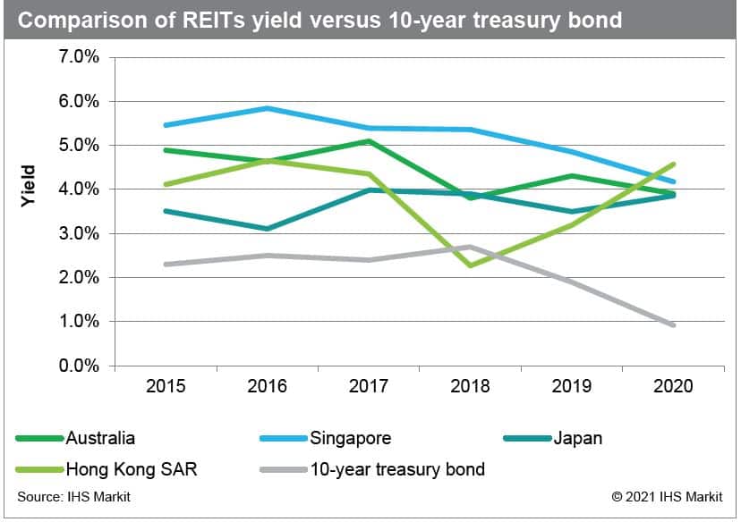 • REITs from Australia and Singapore are expected to offer higher yields in 2022 as compared with Hong Kong SAR and Japan, as the REITs from these two markets dominate the top-10 dividend yield REITs list in 2022.