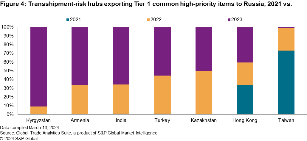 The same countries were then analyzed to compare their trade activity with Russia for Tier 1 items. The largest exponential increase in exports of Tier 1 items to Russia came from Armenia, India, Turkey and Kazakhstan. In 2023, Armenia and Kazakhstan exported approximately $25.5 million and $18.3 million worth of Tier 1 items, respectively, whereas in 2021, there was almost no reported trade. Goods classified under "HS Code 854239: Electronic integrated circuits" were the most exported in 2023; these are goods that could be used for military surveillance, communications and weaponry. South Africa and Brazil did not export Tier 1 items to Russia pre- or post-invasion and therefore were not included in Figure 4. As for Taiwan, the aggregated value of exports to Russia decreased year on year following public disclosures from the country's ministry of foreign affairs to align with Western regulators in strongly condemning Russia's activities and, in turn, enforcing similar sanctions to Western regulators. Kyrgyzstan was not listed as a large importer of US-manufactured items of the Tier 1 classified goods, although the country reported exponential increments in exports of those same goods to Russia. Market Intelligence trade data identified Kyrgyzstan's large trade partner for importing those goods was Hong Kong, a country with no enforced trade embargoes on Russia to date.