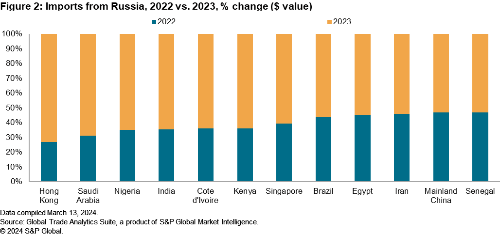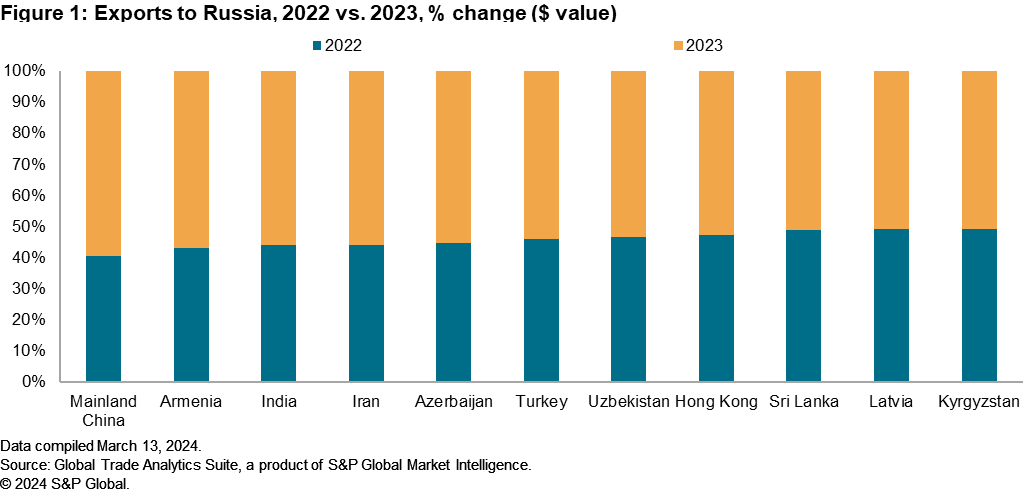 To understand which assumed transshipment points could be used to facilitate trade with Russia, it is important to first understand the impact sanctions have had on Russia’s ability to import goods from other countries. S&P Global Market Intelligence extracted data from customs agents and national statistical authorities to highlight individual country exports to Russia. Figure 1 highlights the percentage change in value of goods (US dollars) exported to Russia, comparing 2022 against 2023. The data show countries with historically strong trade ties to Russia continued the trend, with mainland China and India increasing overall value of exports by more than 45% and 25%, respectively, in the year following the invasion. Neighboring countries to Russia and those with no enforced sanctions on the country to date, such as Armenia, Azerbaijan, Iran, Turkey and Uzbekistan, all expanded their trade exports to Russia in 2023.