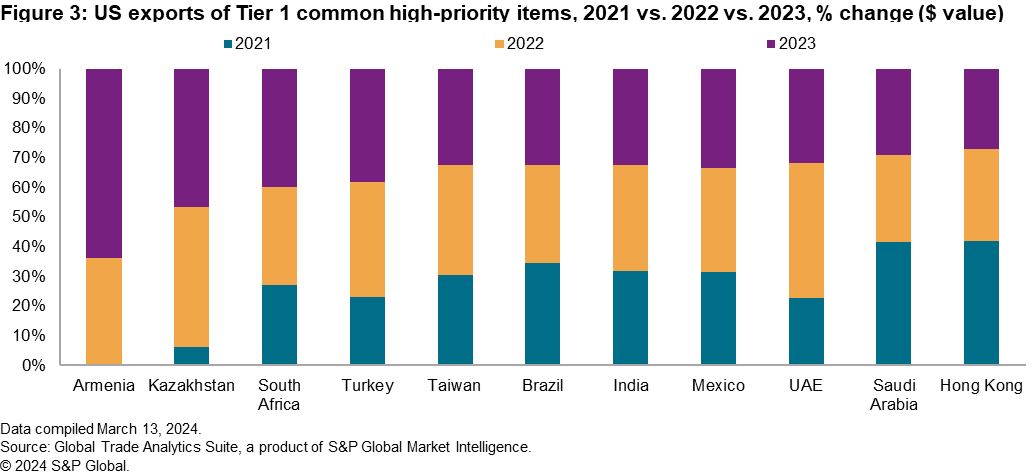 In February 2024, the EU, in coordination with the US, the UK and Japan, enforced further sectoral sanctions on Russia, aiming to curtail its military production. The addition of Tier 4.B. and five new HS codes to the existing 45, covering microelectronics, wireless communication equipment, navigation equipment and different types of electronic manufacturing equipment; it included computer numerically controlled manufacturing equipment, machinery for milling, boring and drilling, and metal machining equipment. Market Intelligence trade data were used to analyze each tier of common high-priority Russian items to understand the year-on-year change in value (US dollars) of US-manufactured items being exported to high-risk transshipment hubs, followed by an analysis to see whether those same countries were reexporting those goods to Russia.