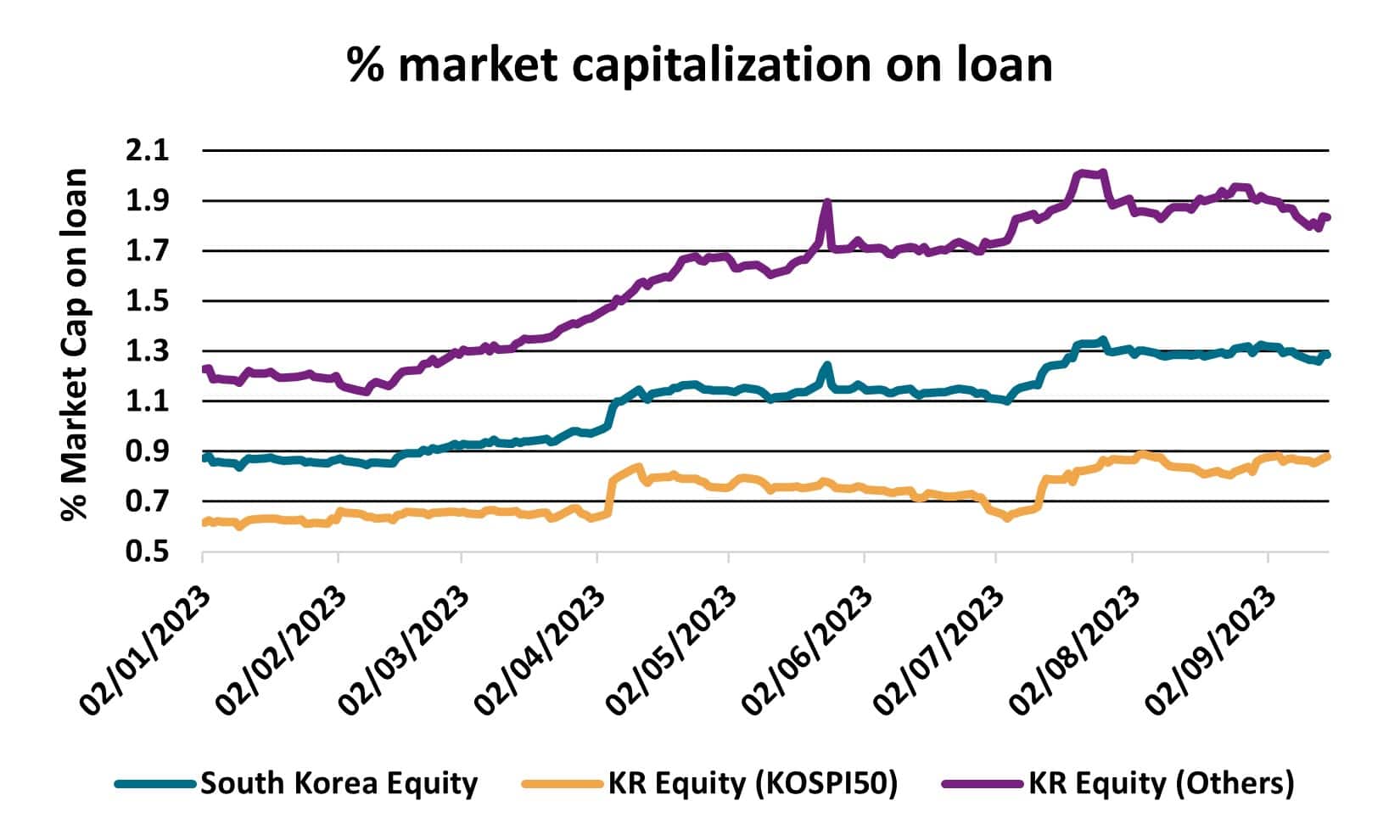 Since the beginning of 2023 the KOSPI index in South Korea has increased by circa 14%. Whilst this is an impressive rise in itself, it's small and mid-cap equivalent, the KOSDAQ has overshadowed this level of return by generating gains of almost 35%. As market valuations have increased, so has the amount of the securities lending activity taking place within the market. The percentage of market capitalization on loan in South Korea has been growing steadily since the beginning of the year reaching a peak of 1.32% across all South Korean equities during August.