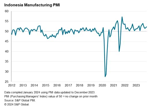 The S&P Global Indonesia Manufacturing Purchasing Manager's Index (PMI) rose to 52.2 in December, up from 51.7 in November, to signal that manufacturing sector conditions continued to improve and at the fastest rate since September. This extended the current period of manufacturing sector expansion to 28 months.
