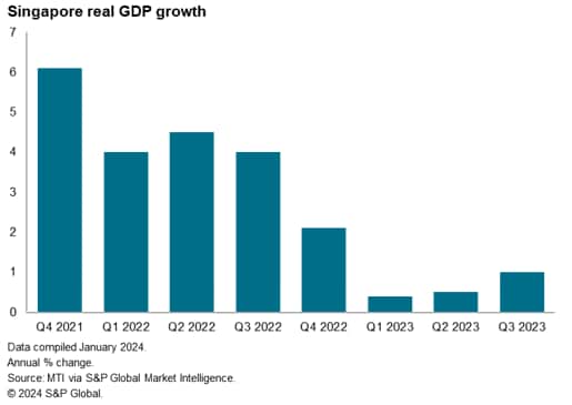Singapore's GDP growth rate improved to a pace of 2.8% y/y in the fourth quarter of 2023 according to the advance estimate of GDP from the Ministry of Trade and Industry (MTI). This compared with GDP growth of 1.0% y/y in the third quarter of 2023. For calendar 2023, GDP growth was 1.2%, significantly slower than the growth rate of 3.6% recorded in 2022, when the economy rebounded strongly after the COVID-19 pandemic.