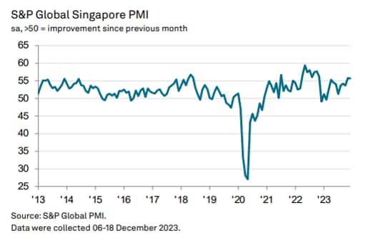 The S&P Global Singapore PMI posted 55.7 in December, edging lower from 55.8 in November. The latest reading signalled a tenth consecutive monthly expansion of Singapore's private sector economy and signalled continued strong business conditions. New orders continued to rise at the end of 2023, growing at the fastest pace in seven months on the back of better underlying demand conditions.