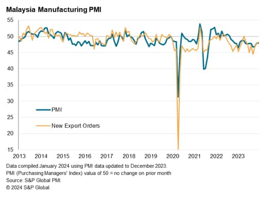 The S&P Global Malaysia Manufacturing PMI was unchanged at 47.9 in December, indicating that business conditions remained challenging for manufacturing firms. Demand conditions in international markets remained contractionary, with new export orders falling for the eighth month in a row, but at the softest rate since May.