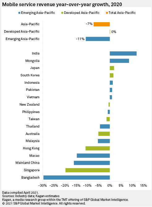 Mobile service revenue in Asia-Pacific declined by 7.23% to $275.93 billion in 2020. Combined with flat growth in mobile subscriptions, this resulted in 8.44% drop in mobile average revenue per user to $5.48 in the region.