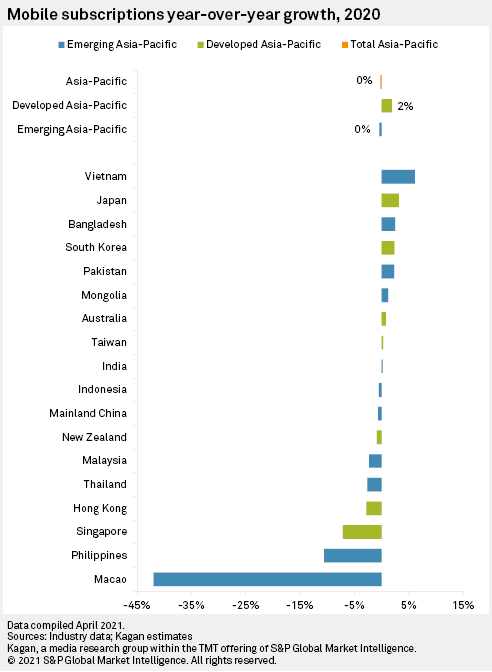 Overall, the pandemic had minimal impact on mobile subscriptions in Asia-Pacific. Compared to the previous year, mobile subscriptions in the region declined by only 0.23% in 2020, reaching 4.22 billion. The situation for each market, however, was quite a mixed bag.