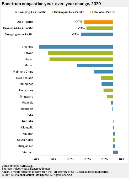 Overall, spectrum congestion in Asia-Pacific dropped by 34.11% in 2020 to about 192,832 subscriptions serviced by a megahertz of spectrum.
