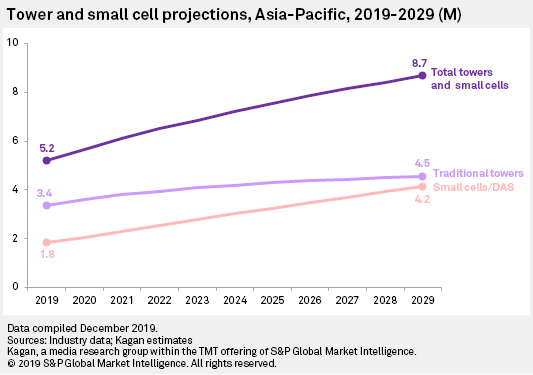 Kagan estimates about 5.2 million towers and small cells in Asia-Pacific by year-end 2019. Majority of these are traditional macro-towers, while the remainder account for small cells and indoor/outdoor distributed antenna systems, or DAS, with most of these in South Korea.