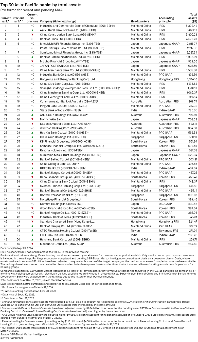 Banks from mainland China dominated S&P Global Market Intelligence's ranking of the top 50 lenders by assets in the Asia-Pacific region in 2023.