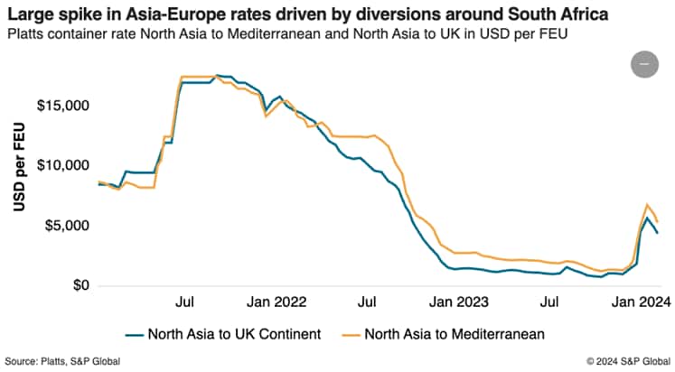 Shippers are facing both a capacity shortage and soaring freight rates on westbound services due to extended transits as vessels sail around the Cape of Good Hope in southern Africa to avoid drone and missile attacks in and around the Red Sea launched by Houthi militants based in Yemen. Sailing schedules show the diversions away from the Suez Canal add about 10 to 21 days on the westbound loop, depending on the service.