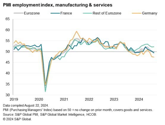 However, the improvement was largely driven by an upturn in the French service sector, which coincided with a temporary boost from the Paris Olympics, hinting that growth could subside again in September. This downbeat prognosis is supported by a renewed fall in employment amid deteriorating business confidence and a third month of worsening new order inflows, the latter especially severe in the manufacturing economy, which remained deep in contraction.